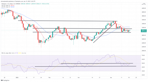 ETH was also trading higher on Tuesday, breaking away from its multi-week lows during today's rally. At the time of writing, ETH/USD hit an intraday high of $3,080.79 earlier in today's session, which is around 4% higher than yesterday's low. Monday's low of $2,903.24 fell below the long-term low of $2,950 to hit its lowest level since March 22.